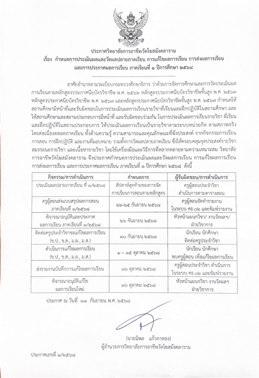 2568-9-11 ประการกำหนดวัผลประเมินผลการเรียน ภาคเรียนที่ 1 ปีการศึกษา 2568