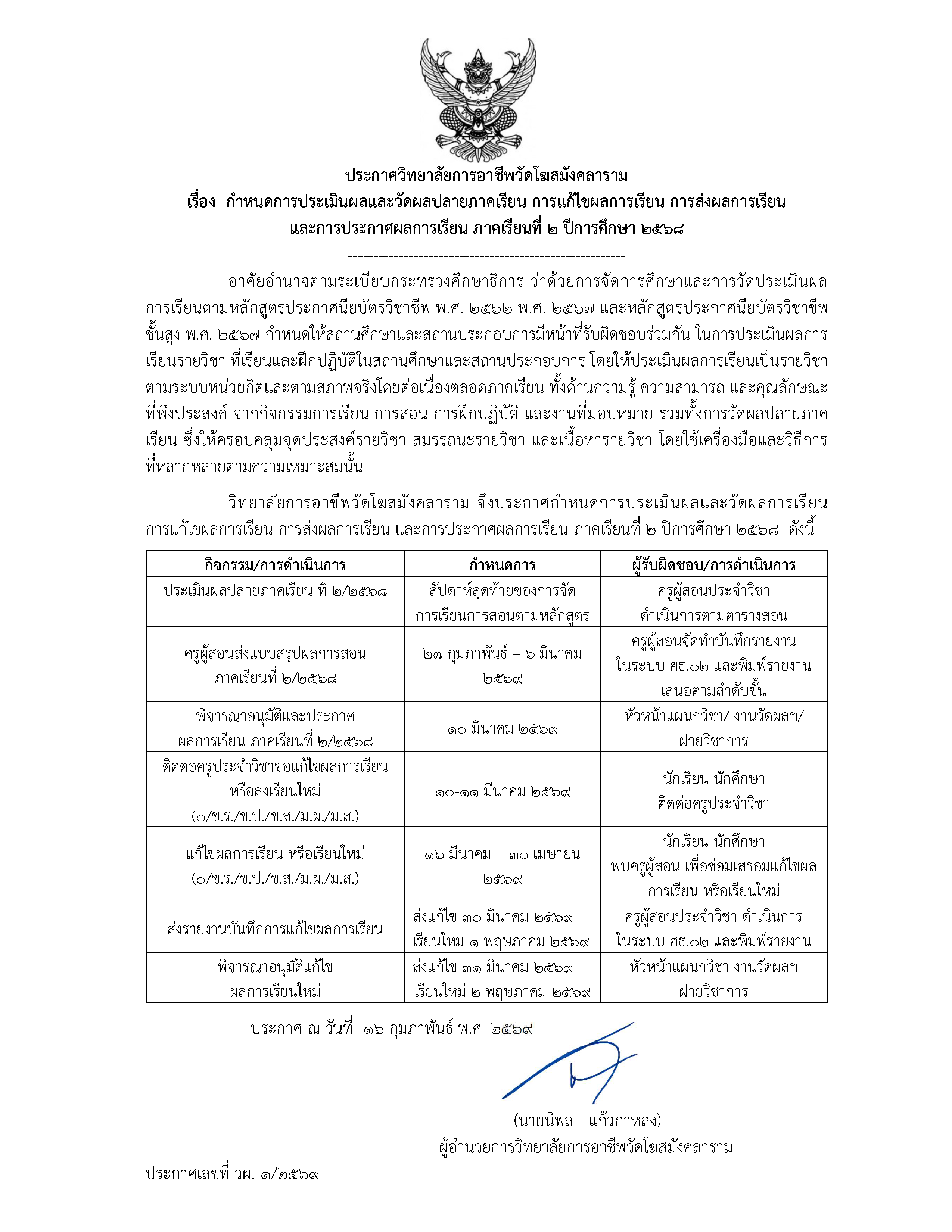 2569-2-16 ประกาศกำหนดการประเมินผลและวัดผลปลายภาคเรียน 2/2568